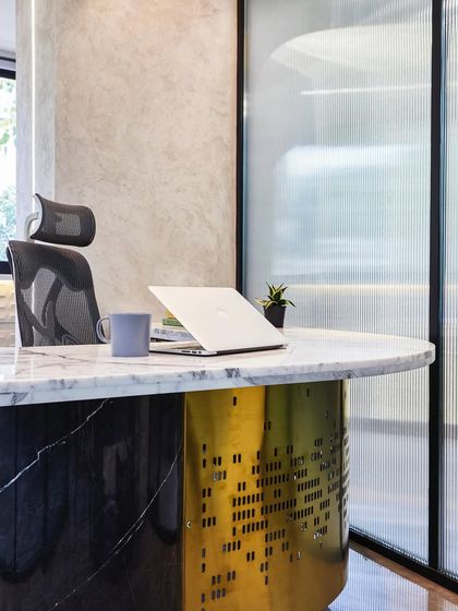 Explore a complete commercial office transformation defined by a modern, sophisticated palette. This project features a blend of cool greys, bold blues, striking marble, and metallic accents to create a dynamic and professional workspace.