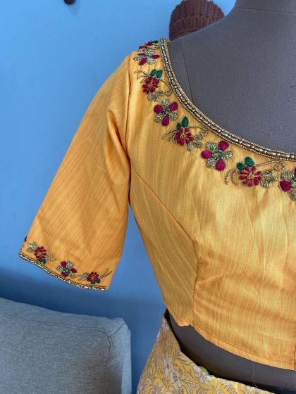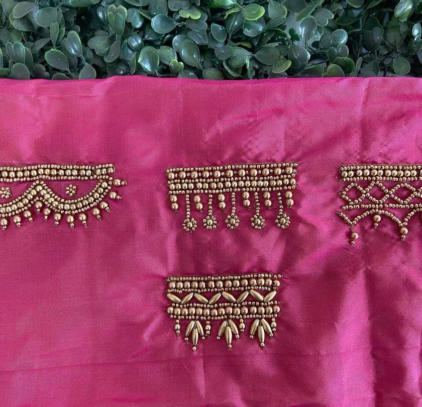 I specialize in traditional Indian hand embroidery like Aari and Zardozi, taught under the guidance of artisans with over 30 years of experience. This section displays the detailed motifs, borders, and patterns we create for bridal wear, blouses, and other custom garments.