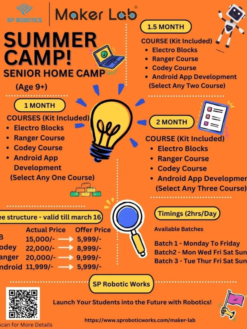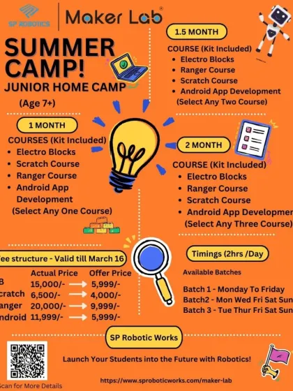 Explore our special programs, including our popular summer camps available both in-person and online. These posters provide all the details on courses, duration, and fees for different age groups, from Junior (7+) to Super Senior (14+), covering everything from electronics to machine learning.