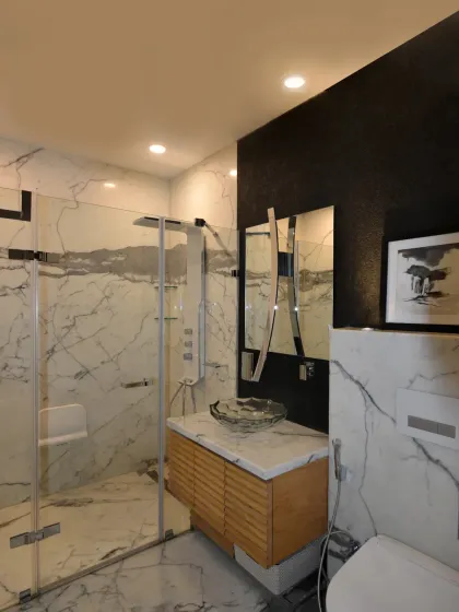I design bathrooms as private sanctuaries for wellness and rejuvenation. Using a palette of luxurious materials like Indian stones and rich woods, I create spaces that feature spa-like amenities, custom vanities, and thoughtful lighting to achieve a perfect balance of modern luxury and serene comfort.
