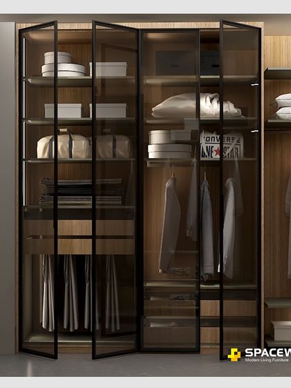 - Grid Layout: Includes trouser pull-outs, saree racks, and glass-fronted internal drawers.