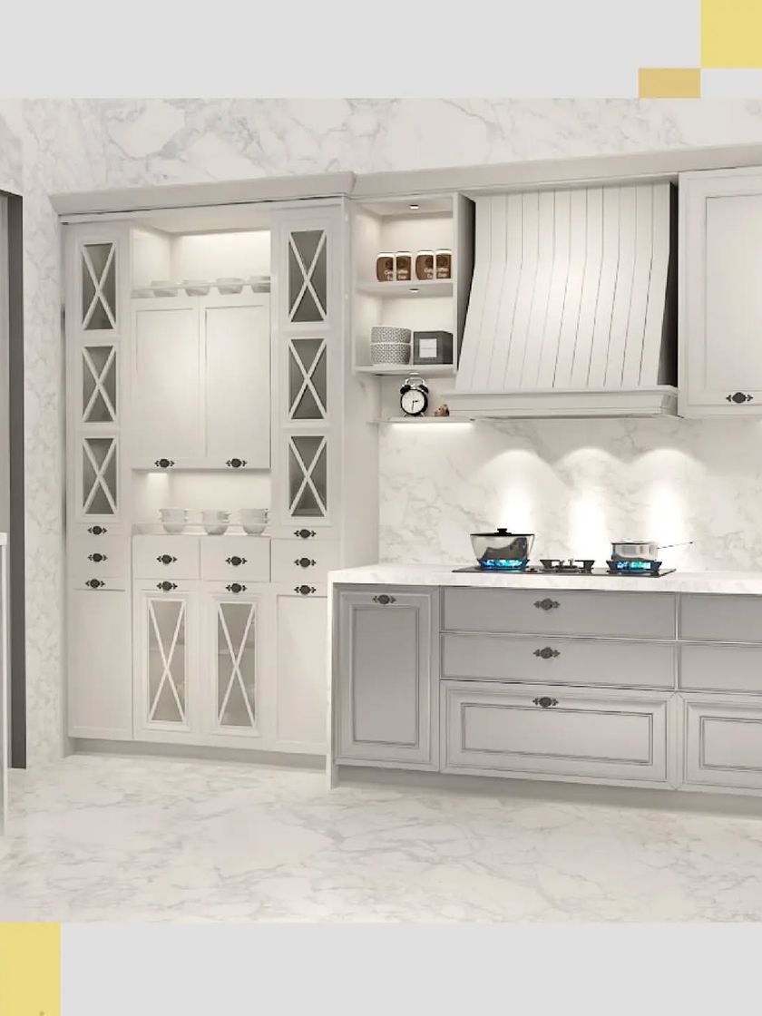 Explore the timeless beauty of my classic white and marble kitchen design. This gallery provides multiple views of a single concept, allowing you to appreciate the shaker-style cabinetry, glass-fronted display cases, marble-patterned surfaces, and integrated features that define this elegant style.