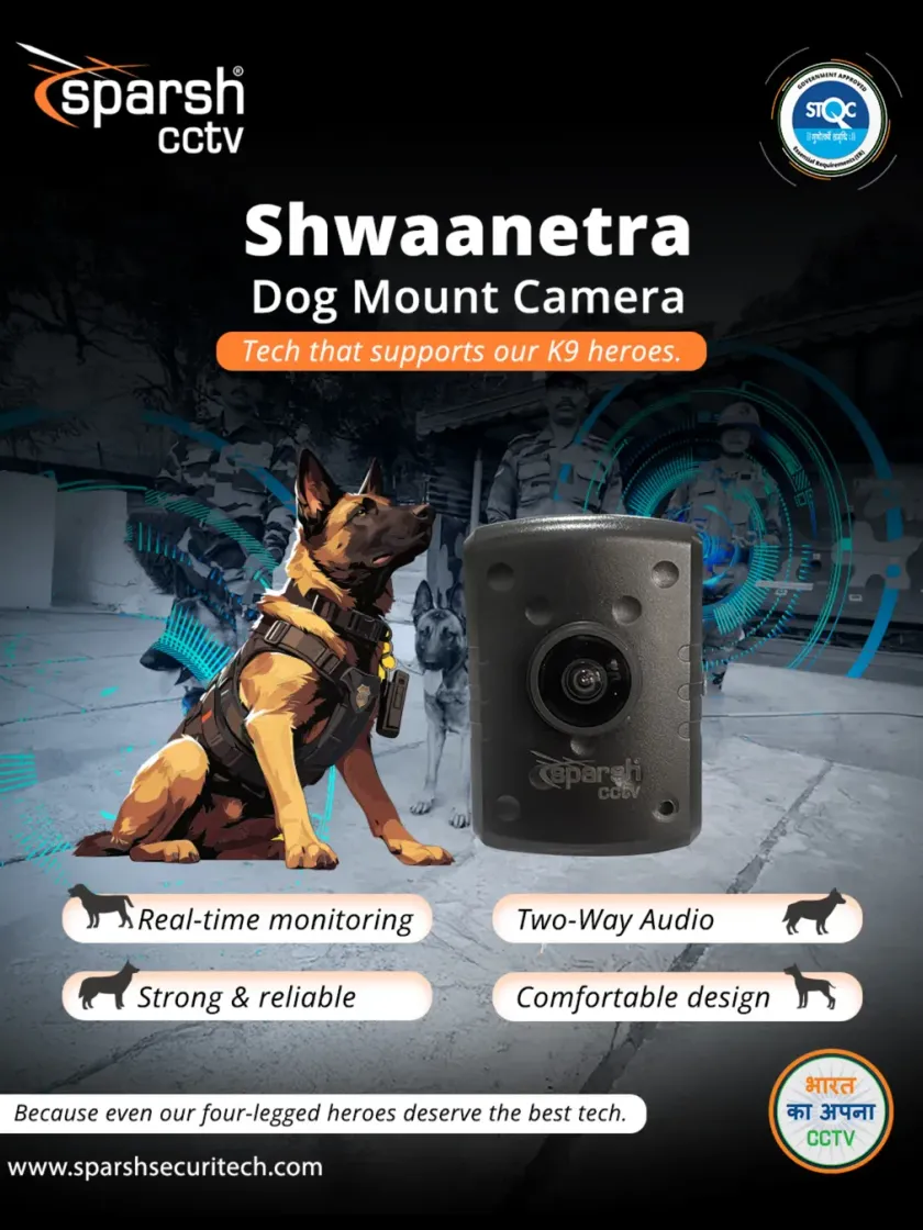 We equip our nation's four-legged heroes with advanced technology. Our Shwaanetra dog-mounted camera provides a real-time, first-person view for K9 units, featuring two-way audio and a durable, comfortable design for critical missions.