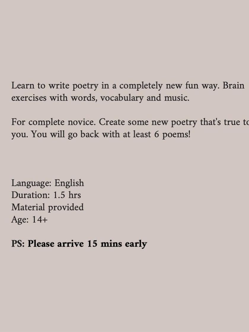 Find all the details for our upcoming Poetry Writing Workshops here. We host these sessions for anyone curious about expressing themselves through words, especially absolute beginners looking for a fun, pressure-free environment.