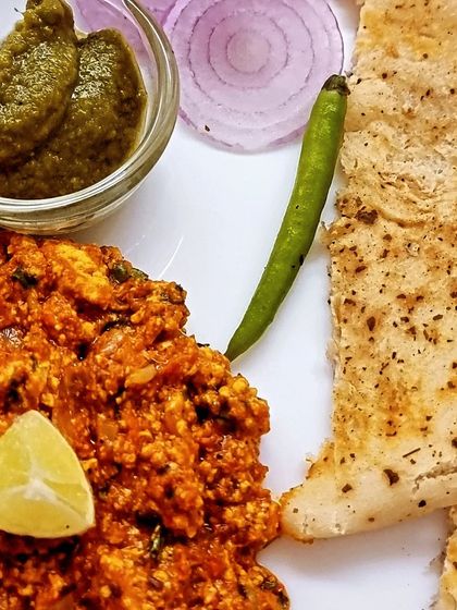 - Sides: Freshly ground coarse Green Chutney and sliced onion rings.