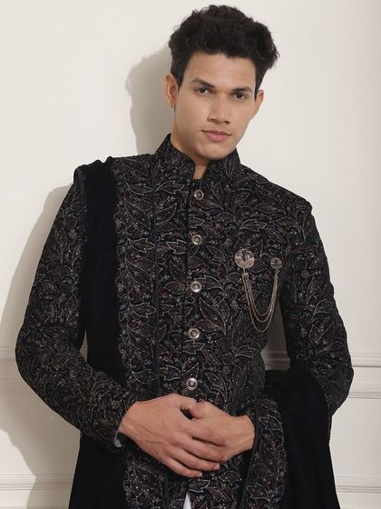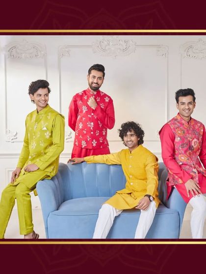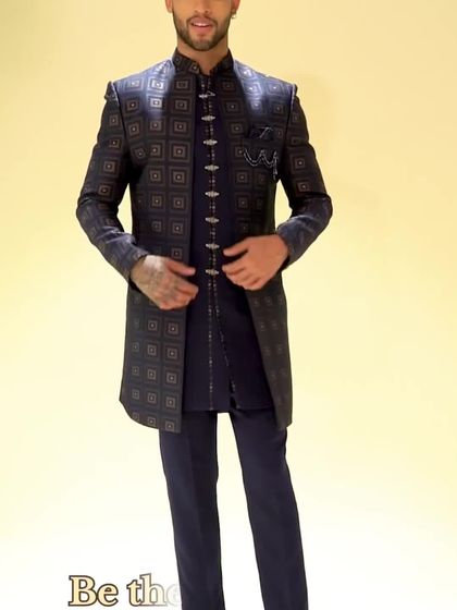 Fashion-forward men looking for unique occasion wear that balances cultural elements with contemporary design, especially for weddings, sangeet ceremonies, and festive celebrations.