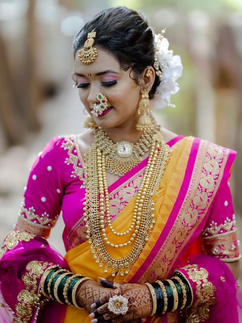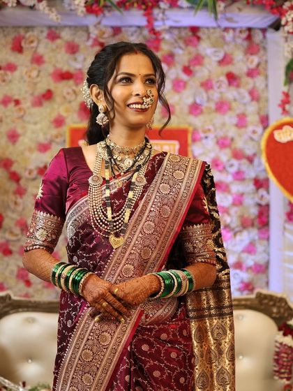 We cherish and celebrate the diverse traditions of India. This gallery highlights our expertise in creating authentic and stunning Maharashtrian and South Indian bridal looks. From the traditional 'nath' and 'mundavalya' to intricate temple jewelry and silk sarees, we perfect every detail.