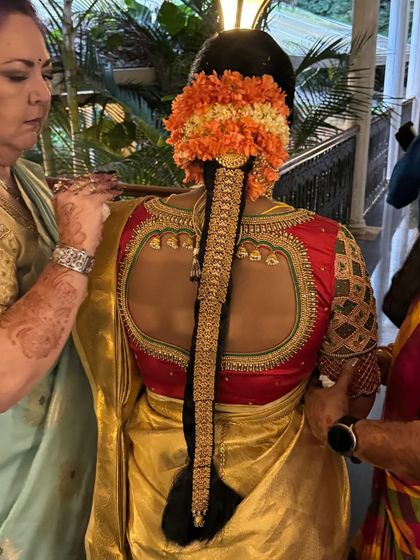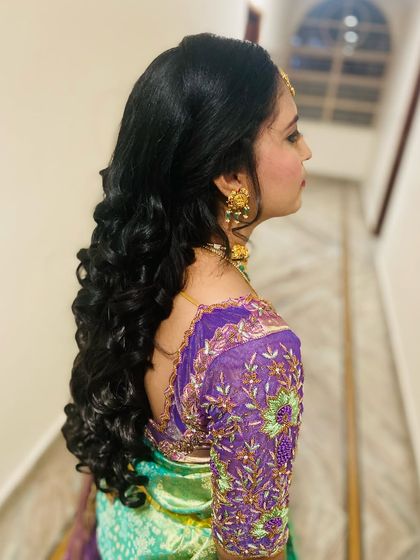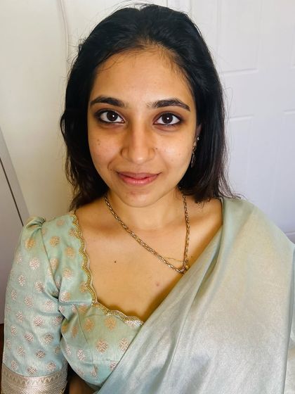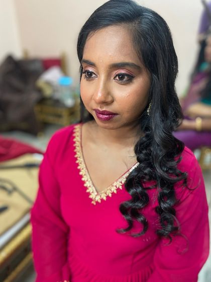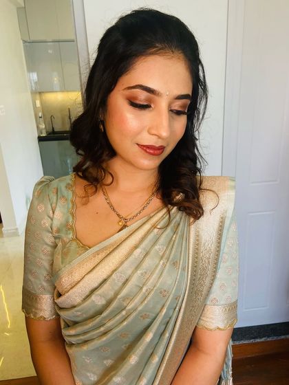 I do custom makeup, hair styling, and saree draping for non-bridal events like poojas, engagements, and family functions, and I come to your location with everything needed.