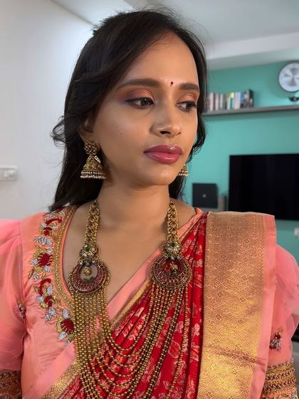 Hey, I’m Srividya from Bangalore. Makeup is not just my job, it’s what I love - honestly, it feels more like a hobby. Got lucky learning from Geethanjali at Makeup Stories, she’s shaped a lot of my work. What really gets me is seeing a bride glow at her muhurtham or a mom smiling at her baby’s naming. My thing? Making folks feel comfy and look their best, not overdone.