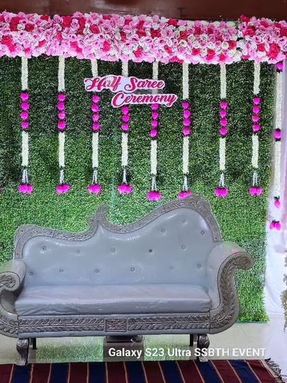 - Stage furniture: Royal sofas, ornate chairs, silver cradle for ceremonies, plus display stands for cakes and sweets. Great for baby showers, naamkaran, half-saree, or any milestone.