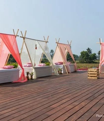 - Mehendi and sangeet are more colourful - loads of pink, green, and orange, with cozy seating and festive hangings.