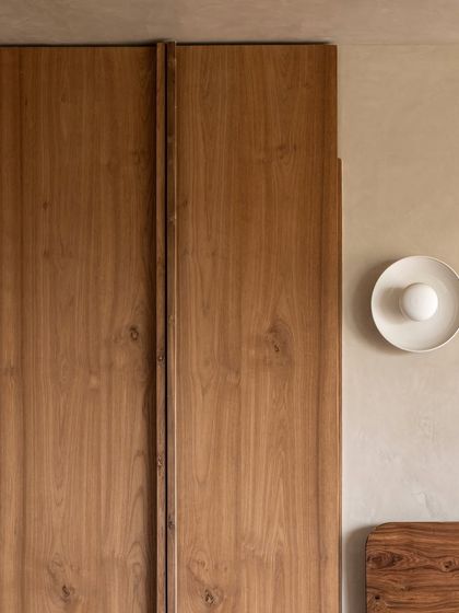 - Floor-to-ceiling wardrobes with hidden handles and breathable rattan shutters.