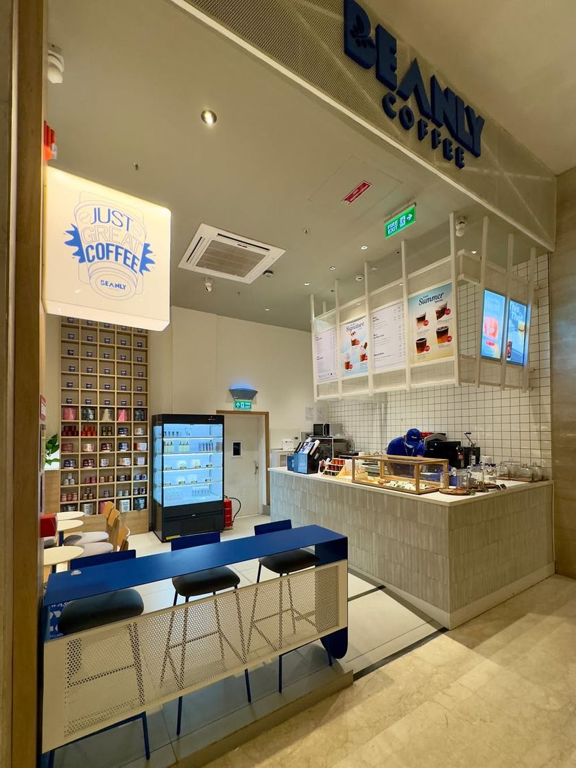 For coffee brand Beanly's first physical outlet, we designed a space that captures its young and energetic identity. We used the brand's electric blue as a vibrant accent against a neutral palette of warm woods and clean whites, creating a modern and approachable QSR-style cafe.