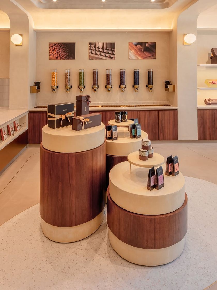 For this flagship chocolatier in Pune, the goal was to create a sophisticated space where the product is the hero. We used a muted palette, clean lines, and seamless finishes, employing details like curved ceilings, custom furniture, and intricate flooring with brass inlays to create an experience of understated luxury.
