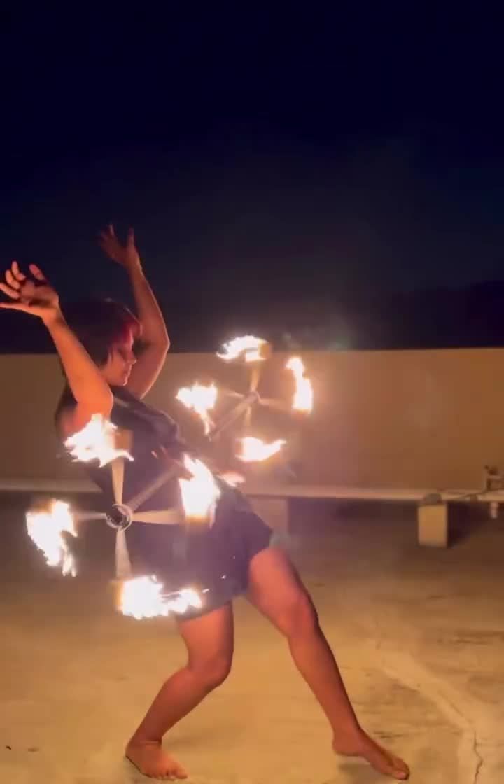 My fire fans are an extension of my hands, allowing me to paint large, sweeping arcs of flame and perform intricate, technical movements. This collection showcases the versatility of fan tech, from powerful stage acts to more meditative, personal flows.