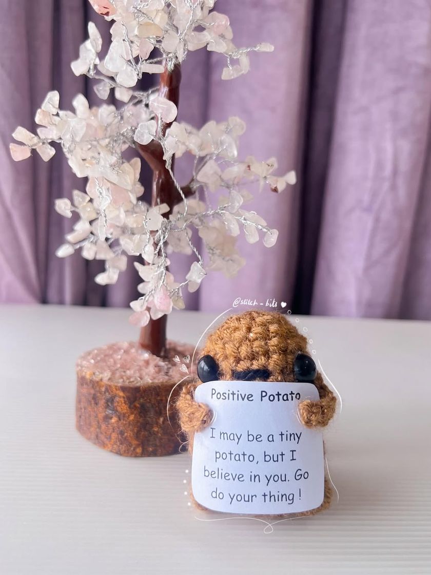 Meet my Positive Pandas and Positive Potatoes. These tiny companions hold little signs with cheerful messages to give you a boost during your workday or study session.