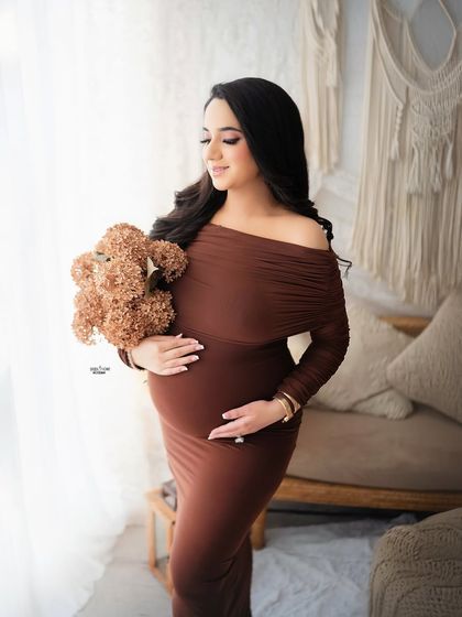 Every shoot is styled by me, so your personality comes through. You get to pick from my closet full of couture maternity gowns and props. Want bodycon dresses that hug the bump? Or flowing fabrics we toss around for those dreamy maternity portraits? I’ve got colors from dramatic black to soft pastels. I love switching up the mood - glam, boho, or florals, just say the word.