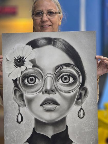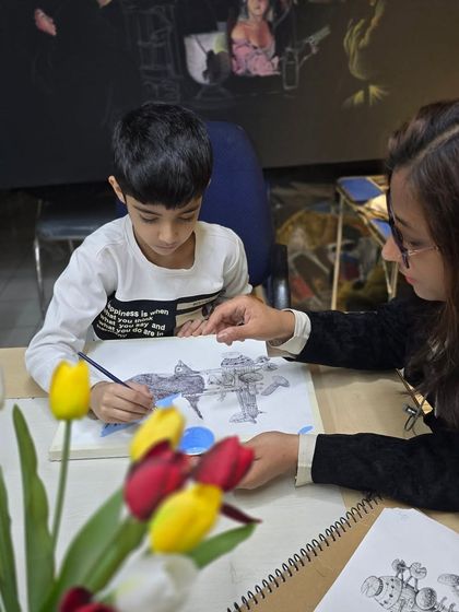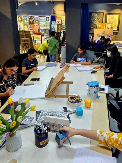 We run focused art workshops where you learn one technique at a time, like ball pen illustration or charcoal portraits, and finish a complete piece by the end of each session.