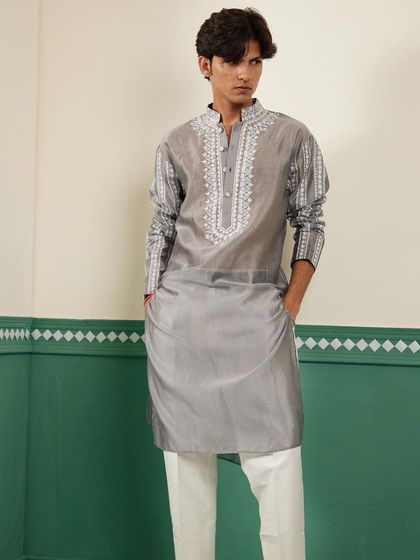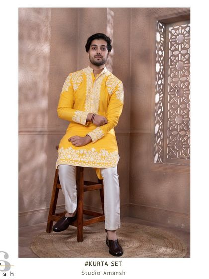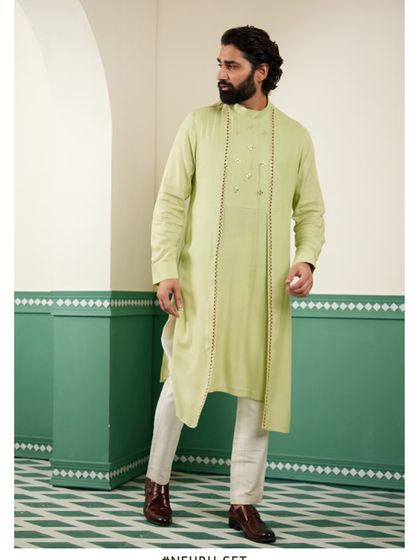 - Made-to-measure kurta set: My kurtas aren’t basic. Flowy drapes, asymmetric cuts, pintuck textures, and rich hand embroidery—always with top-notch fabrics like Chanderi silk or fine cotton.
