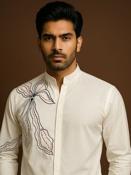 - Embroidery: Machine embroidery on yoke, collar, and cuffs with manual hand-work highlighting (zardozi or bead touches).