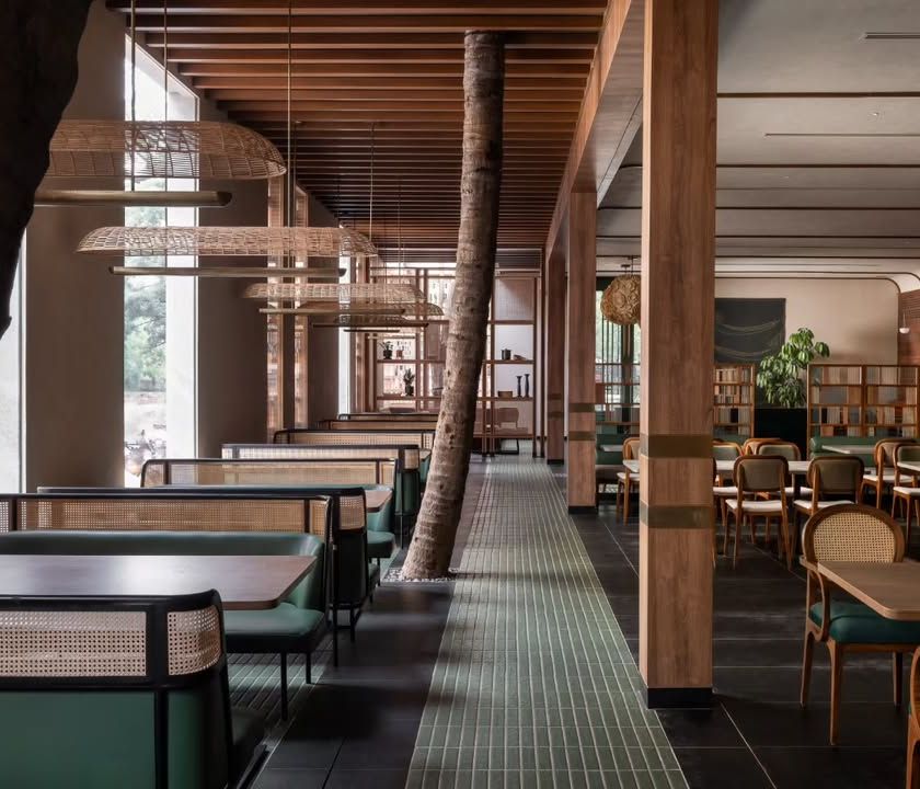 For this vegetarian Andhra restaurant, we designed a space that feels both rooted and contemporary. We preserved existing trees, letting them become the soul of the interior, and used natural materials like terracotta brick, wood, and cane to create a warm, inviting atmosphere with distinct dining zones.