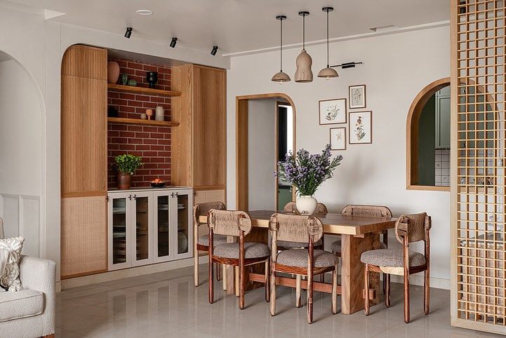 I design living and dining areas to be the heart of the home, filled with warmth and character. By layering natural materials like wood, brick, and cane with comfortable, custom-made furniture, I create spaces that are perfect for both quiet evenings and lively gatherings.