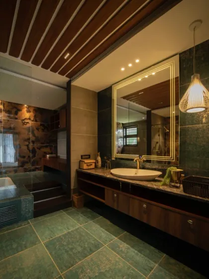 I transform bathrooms into personal spas for relaxation and escape. These spaces often feature bold material choices like dramatic marble or mosaic tiles, along with thoughtful lighting, modern fixtures, and seamless integration of nature to create a serene and luxurious experience.