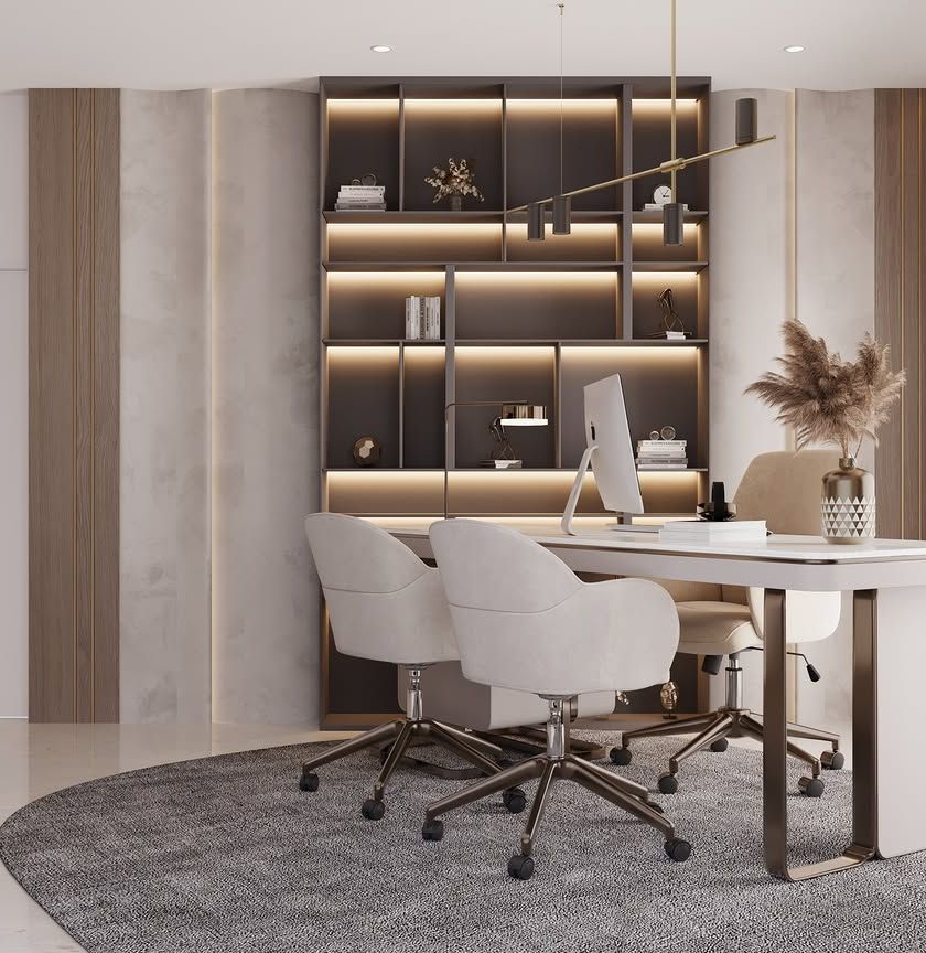 We design sophisticated home offices that blend productivity with the comfort and aesthetic of a luxury residence. Our solutions include custom desks, integrated shelving with ambient lighting, and an ergonomic layout to create an inspiring and efficient workspace.