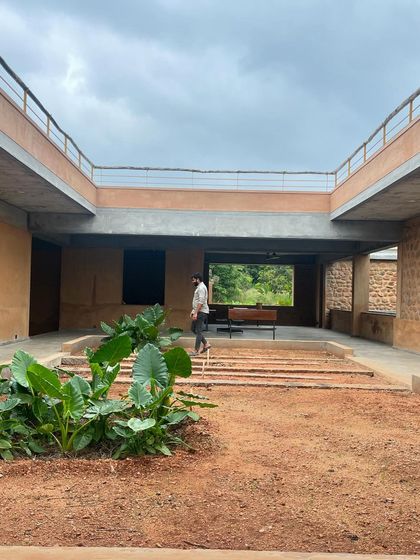 Our projects feature earth block construction, local stone, exposed brick, and concrete. We use what’s available on-site whenever we can - like boulders for rubble walls. Techniques like rat-trap bond brickwork and filler slabs save energy and keep interiors comfortable. Sometimes, we get creative with upcycled building materials, like using bottles filled with soil for walls.