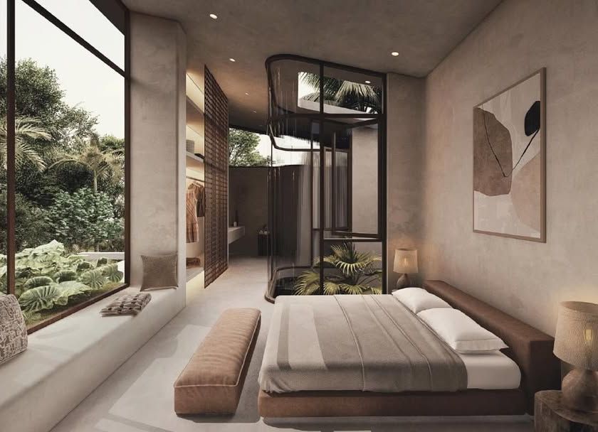 We design bedrooms as personal retreats that offer tranquility and a deep connection to the outdoors. Our suites often feature integrated open-concept bathrooms, private balconies, and large windows that frame the landscape, all finished with a palette of warm, natural materials.