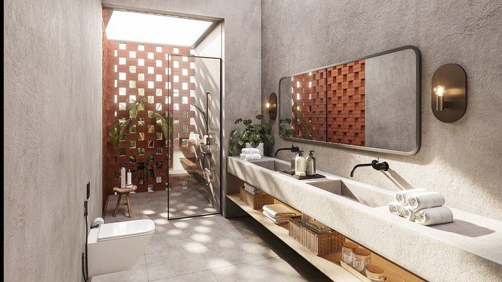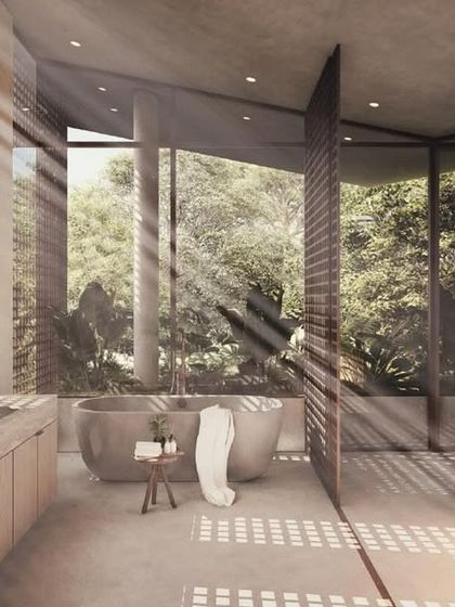 Our bathrooms are conceived as immersive, spa-like experiences. We specialize in creating open-air concepts with features like outdoor showers and private courtyards, using natural and expressive materials like stone, concrete, and marble to craft spaces for rejuvenation.
