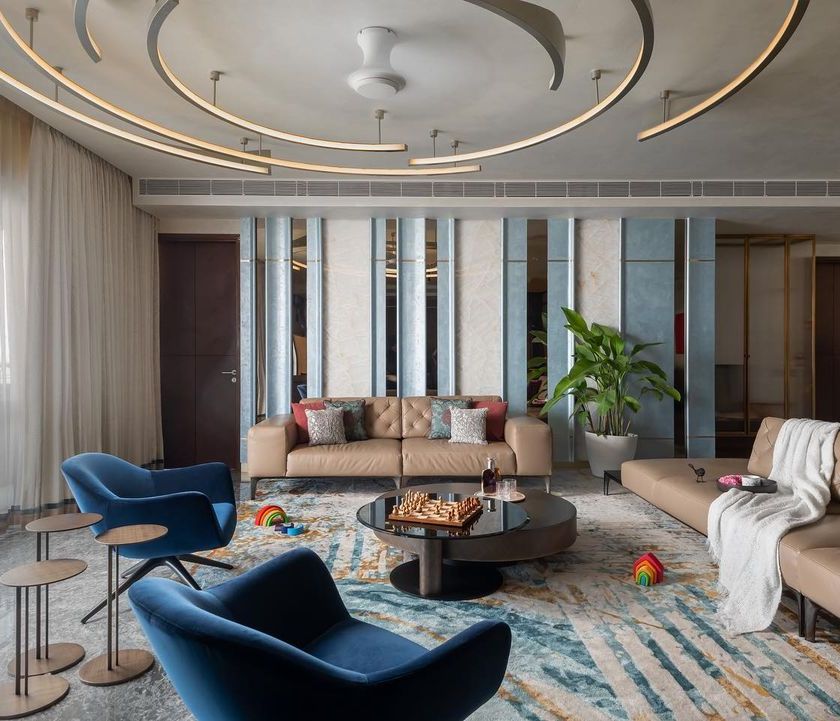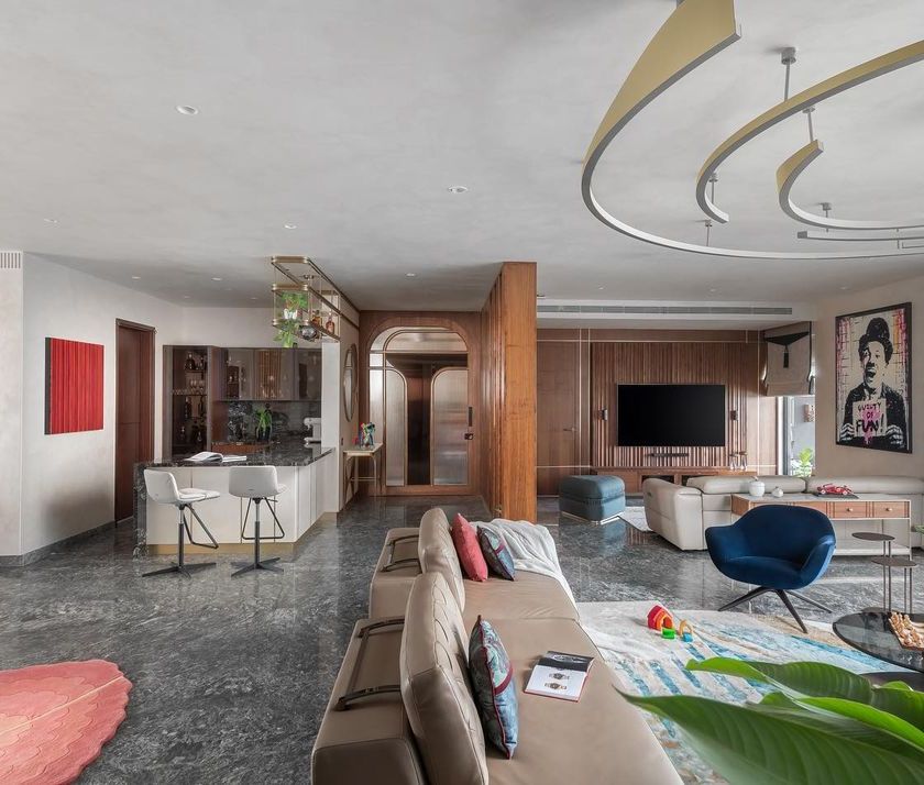 Located by Bangalore's Jakkur Lake, this apartment is a study in contextual design, where the ripples and tranquility of water are translated into the language of the space. We combined two separate units to create an expansive, open-plan home with multi-functional areas, from a hidden study to a media room, all defined by curves, layered textures, and a rich material palette.