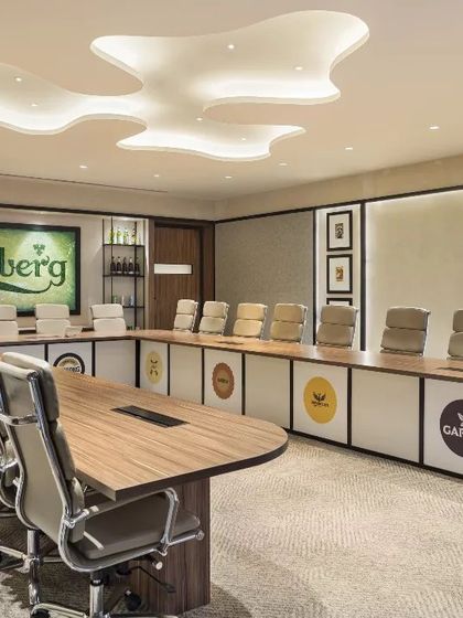 - Ceiling Design: Industrial chic exposed concrete with acoustic baffles mixed with designer gypsum false ceilings in boardrooms.