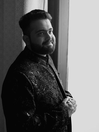 We ensure the groom's style and personality are captured with equal importance. Our groom portraits are a mix of classic, candid, and cinematic shots that reflect his look on the big day.