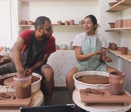 Hey! We’re Shreya and Mahanth, the duo behind Studio Mudlife. Mahanth’s been at the wheel for years, I jumped in because he’s a potter (and because I got hooked on the studio life). Sure, working together gets messy sometimes, but we’ve figured out our groove. We really care about making Mudlife a safe, chill spot for everyone – my counselling background helps with that. Making pottery and seeing folks unwind here, that’s what keeps us going.