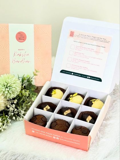 I create thoughtful, small-batch edible gifts for festivals like Rakhi and Diwali. These hampers range from personalized brownie boxes with messages to curated sets with assorted treats, all beautifully packaged to share with loved ones.