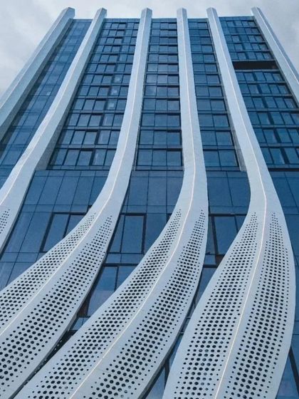 This mixed-use revitalization project in Mumbai seamlessly integrates an existing 1980s structure with twelve new residential floors. The design features undulating calligraphic strokes that form a perforated screen for the commercial levels and open up for panoramic views on the residential floors, creating a new urban landmark.