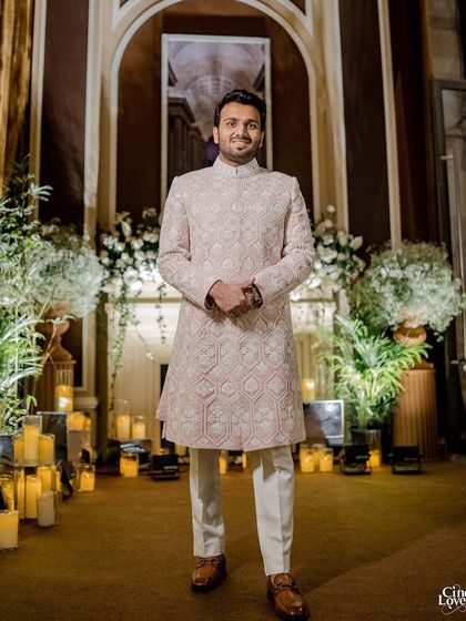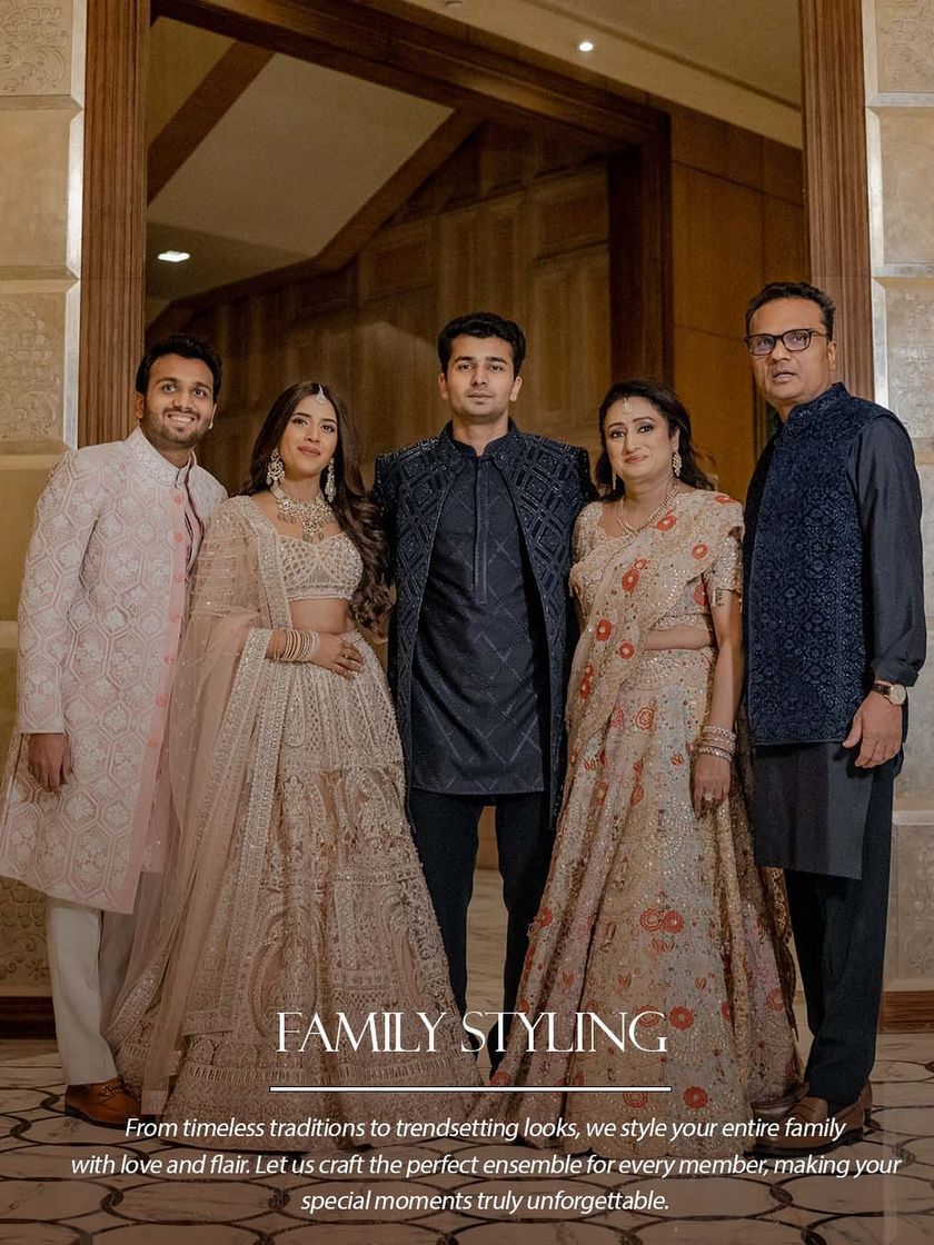 We help you move beyond the standard sherwani to find a look that is sharp, comfortable, and distinctly you. We focus on custom fits, unique silhouettes, and thoughtful details that complement your partner and make you feel confident.