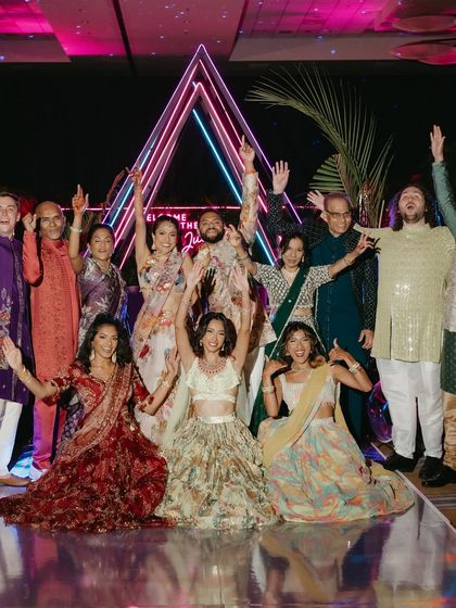 The Sangeet is a celebration of joy, and the wardrobe should reflect that. We specialize in creating vibrant, harmonious color palettes that allow each family member's personality to shine while ensuring the group looks unified in photos. We focus on balancing jewel tones, pastels, and prints to create a visual symphony.