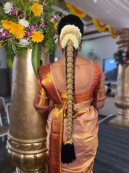I do South Indian bridal makeup, hair, and saree draping for all wedding events, making sure your look stays fresh, matches your saree and jewellery, and lasts all day.