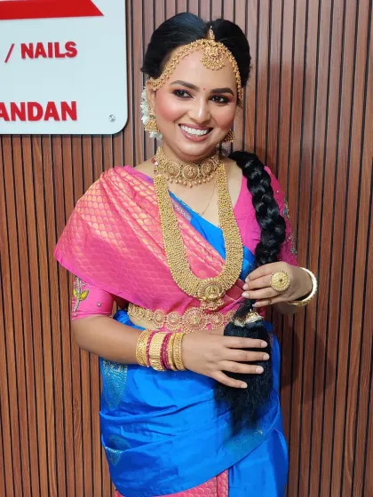 I teach practical beauty skills from bridal makeovers to saree draping, with hands-on training, business tips, and support for beginners even after the course.