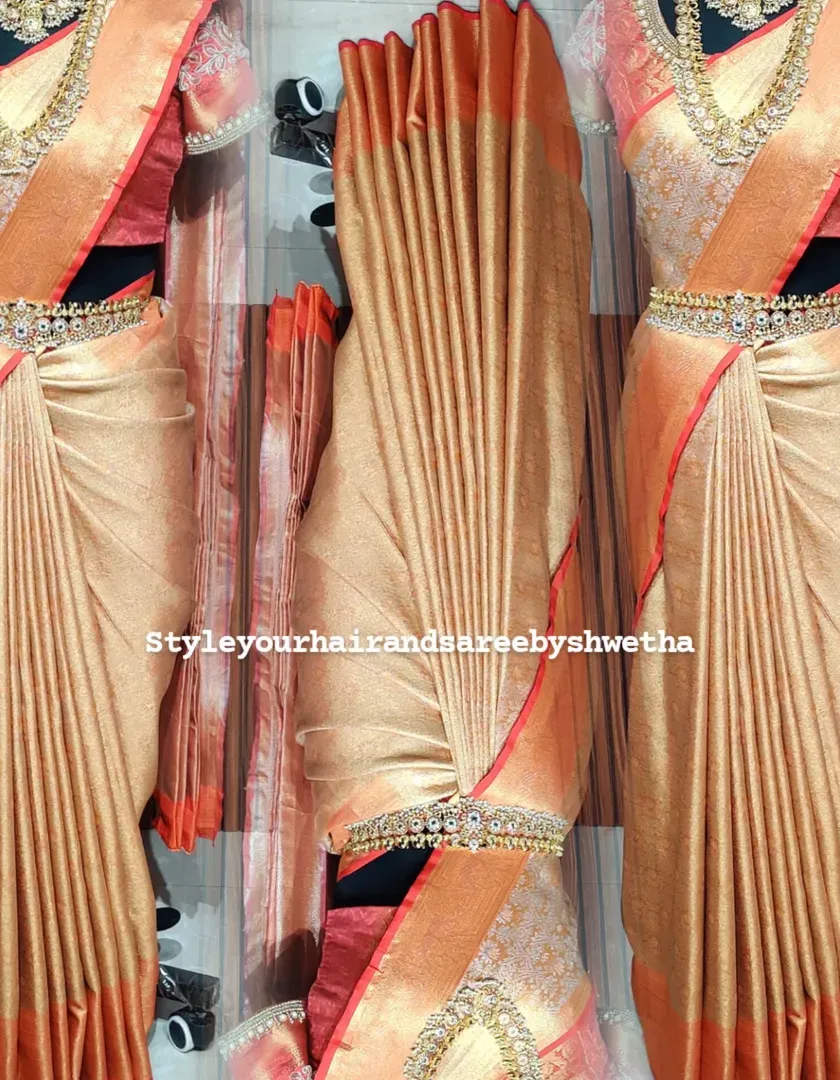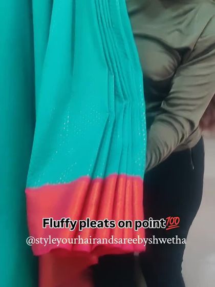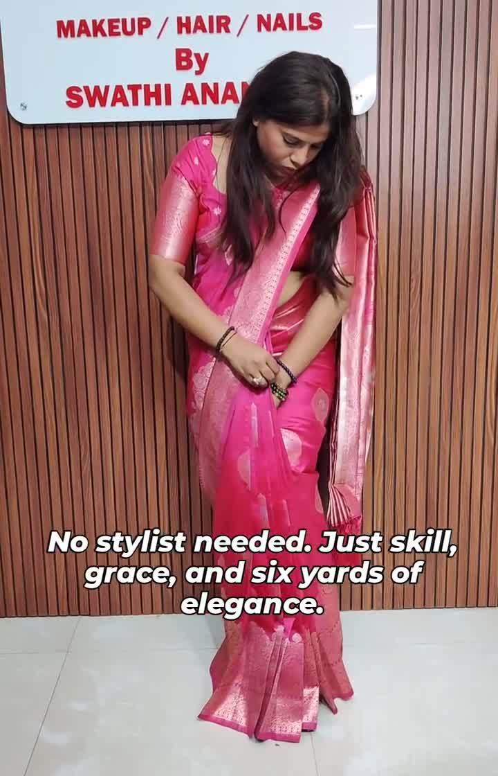 The secret to a rich, voluminous saree look is in the pleats. I create my signature 'gundu' or fluffy pleats that give the saree beautiful body and movement, ensuring they stay perfect all day long.