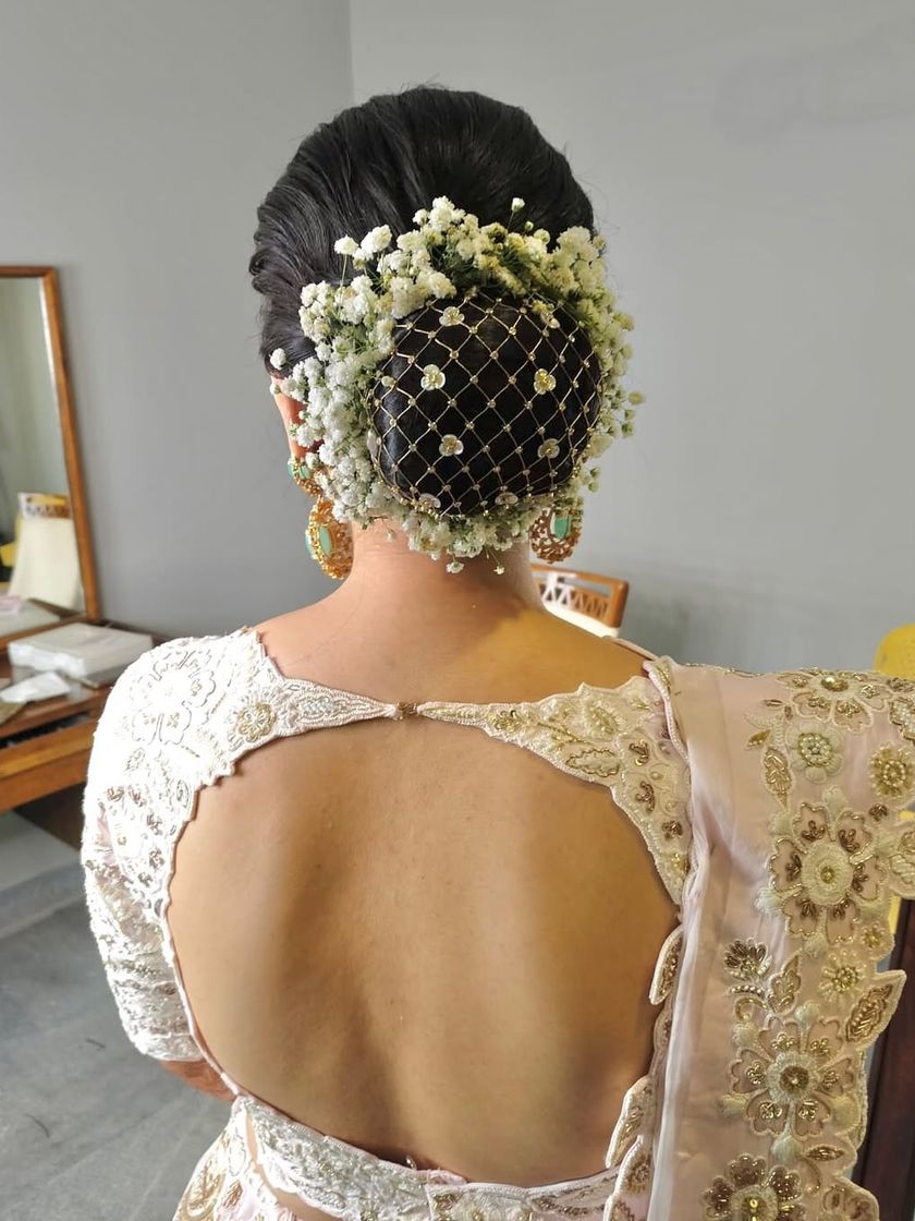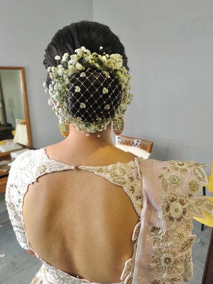 An updo is a timeless choice for any bride. I create everything from classic, sleek buns wrapped in fragrant jasmine for a traditional look, to soft, romantic messy buns with delicate flowers for a modern reception. These styles are designed to be elegant, secure, and perfectly complement your outfit and jewellery.
