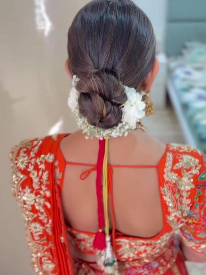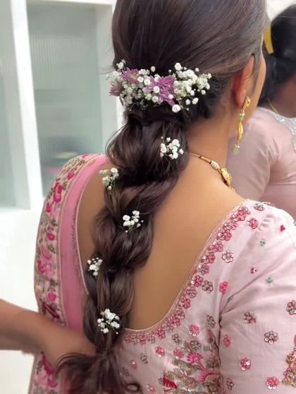 My specialty lies in creating authentic South Indian bridal braids, perfect for the muhurtham ceremony. I craft everything from classic plaits and fishtail braids to elaborate jada styles, often adorned with fresh jasmine, roses, and traditional temple jewellery.
