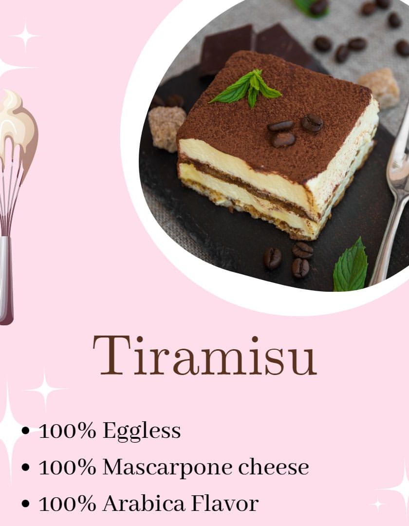 I create timeless desserts with my signature 100% eggless promise. My Tiramisu is made with pure Mascarpone cheese and rich Arabica coffee, offering an authentic and sophisticated experience without compromise.