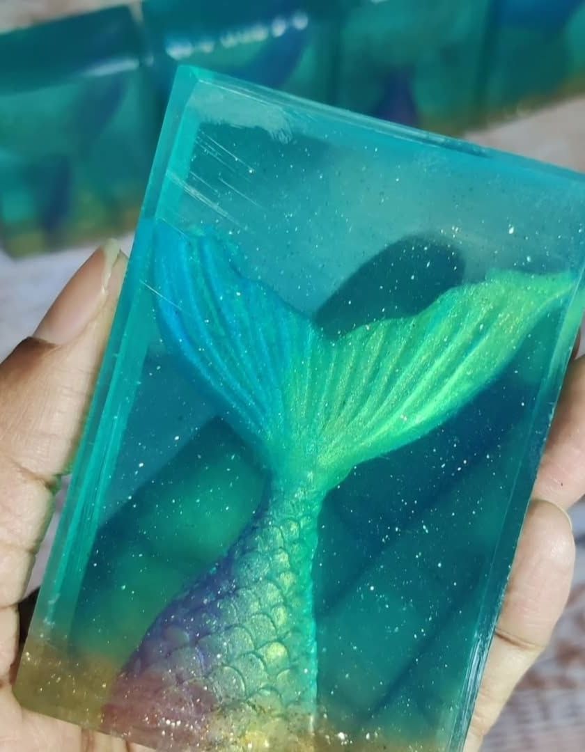 Explore the beauty of transparent soaps, which I make from scratch using a special hot process method with oils and lye. This collection features designs with embedded elements like mermaid tails and florals, creating a stunning, jewel like effect that is almost magical.
