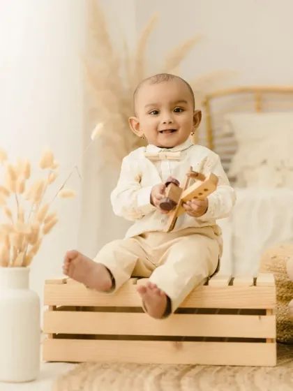 We love celebrating culture and offer unique traditional themed shoots for your newborn. Our popular 'Chotishi Rakhumai' setup is a beautiful way to honor your heritage, complete with authentic attire and props for a timeless portrait.