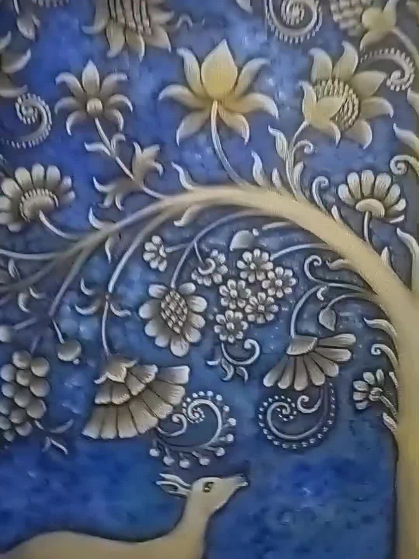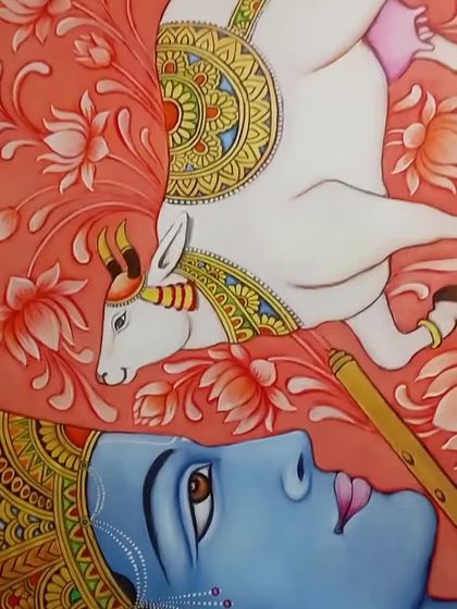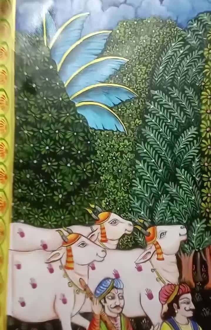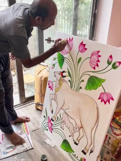 I create custom Pichwai paintings, a 400-year-old art form from Nathdwara, Rajasthan. I paint traditional subjects like Shrinathji, sacred cows, and lotuses, and can also adapt the style for modern homes while keeping its spiritual feel.