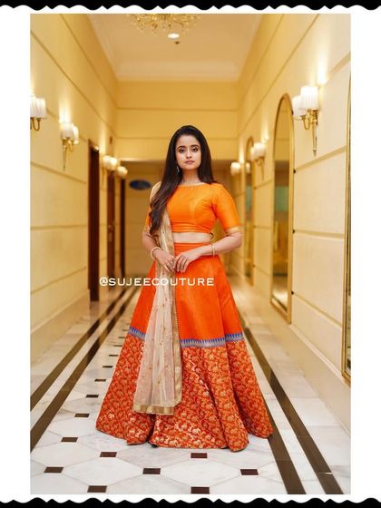 - If you want a custom South Indian lehenga or a classic half saree (langa voni), I’m all in. I use fabrics like Ikkat and Benarasi silk, add embroidered vaddanams (belts), and build full sets that pop in photos.