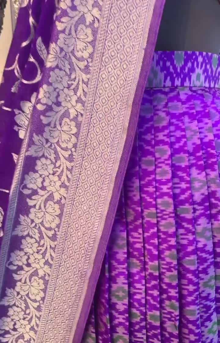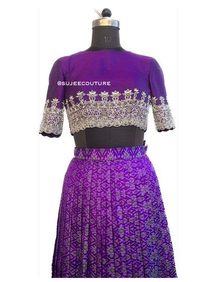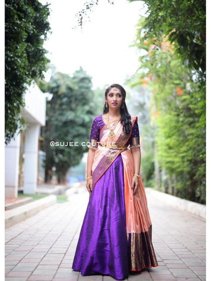 I design complete South Indian ensembles, including classic half sarees (langa voni) and custom lehengas. I use rich fabrics like Ikkat and Benarasi silk and can create matching embroidered vaddanams (belt) for a fully coordinated look.